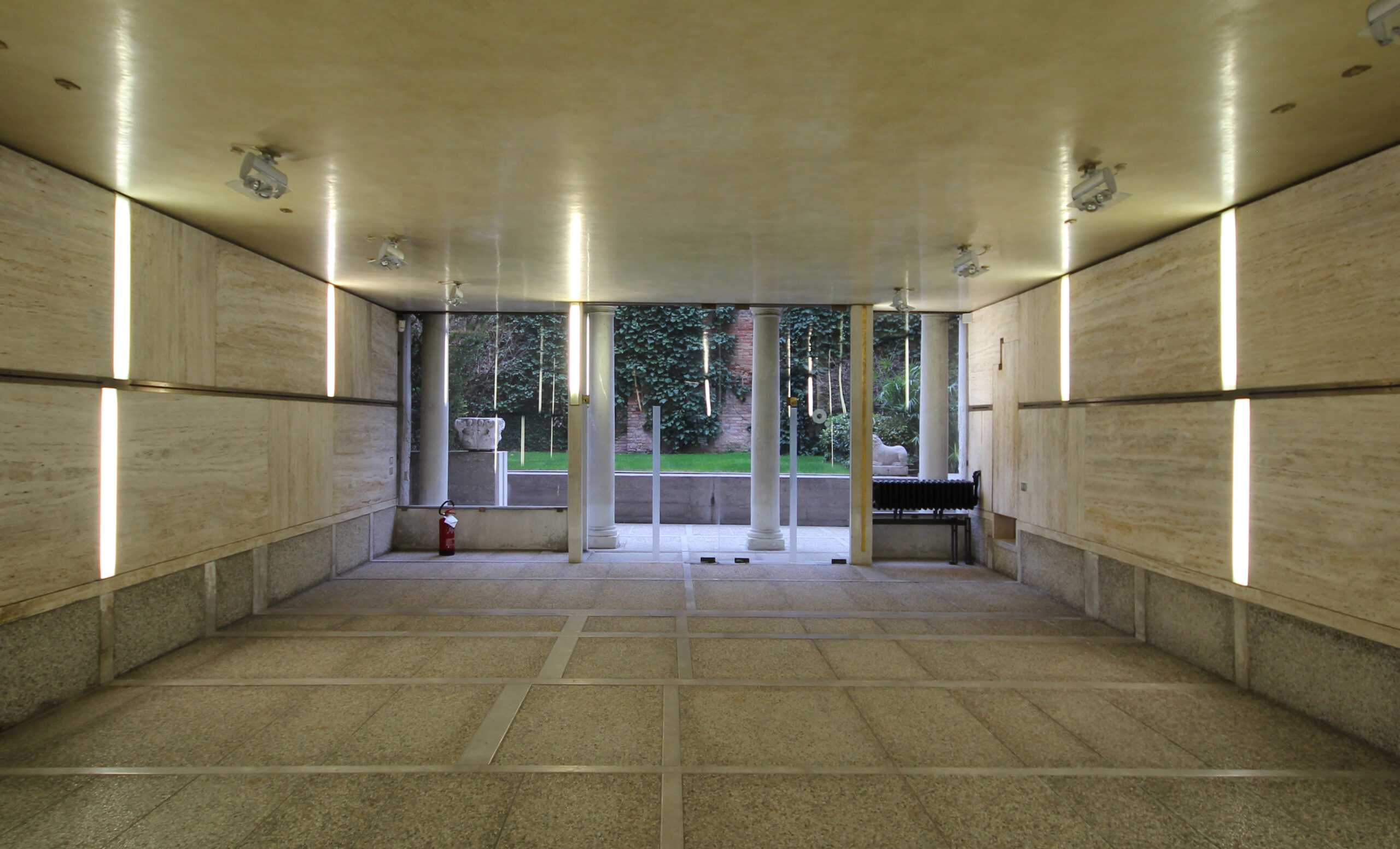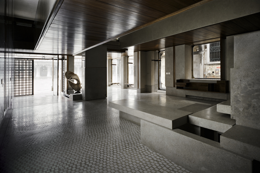 Le tour commence avec la visite à la Fondazione Querini Stampalia renouvelée dans les années ’50 par Carlo Scarpa qui restaure une partie du rez-de-chaussée, un nouveau pont d’accès et le jardin à l’arrière : un bassin nivelé fait de ciment et de mosaïque avec un petit canal avec deux labyrinthes. Dans cet espace on ouvre le cœur de l’exposition: la salle Gino Luzzatto, correspondant au « portego » original. L’étape suivante est le Magasin Olivetti directement sur la Place Saint Marc que Scarpa a dessiné pour l’entreprise Olivetti, la plus importante de ce temps là qui produisait les machines à écrire et les calculateurs.